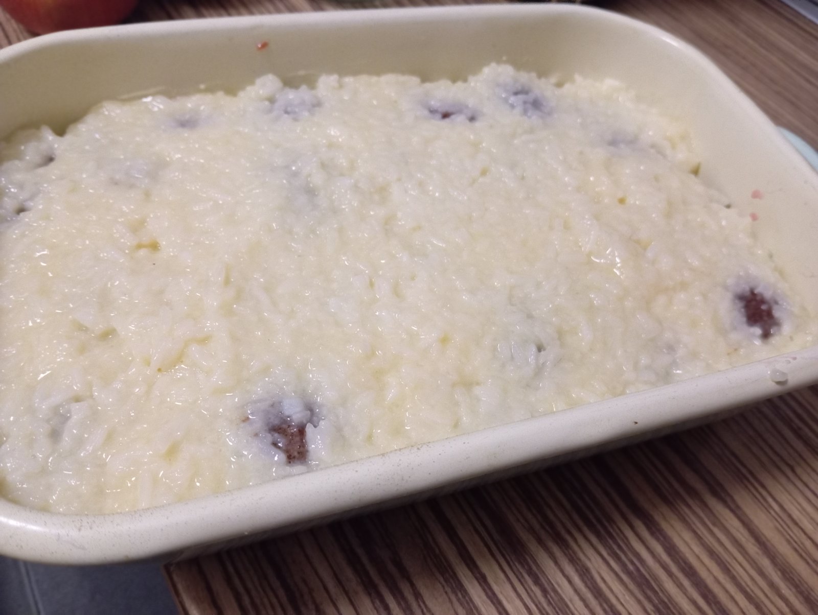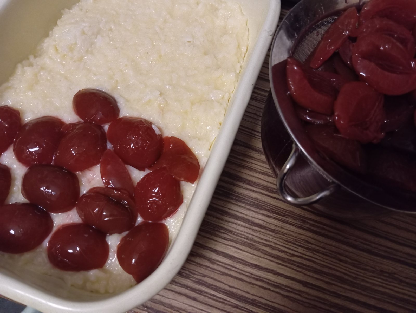 Zbytek rýže od oběda, zavařené švestky ze zahrádky, vajíčko, troška mléka, čekankový sirup, skořice. Těším se.