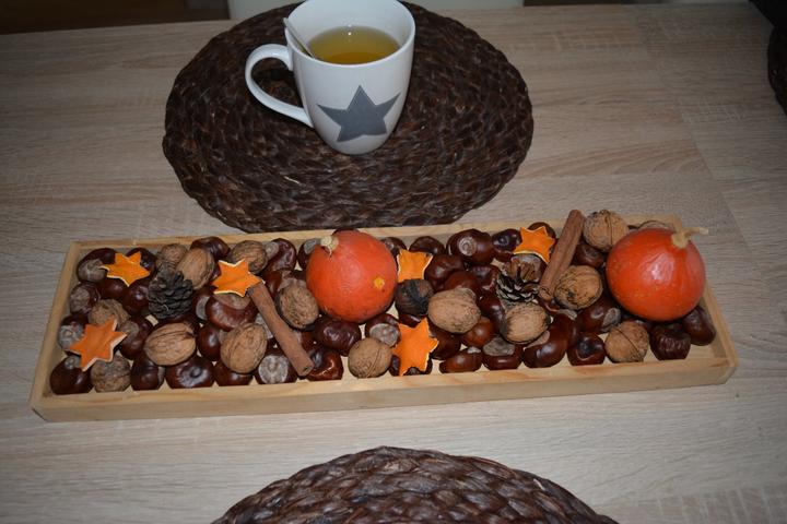 Dekorace alá co jsme nasbírali na procházce, na zahradě a v domácnosti 🙂 a misku vyrobil táta :-*
