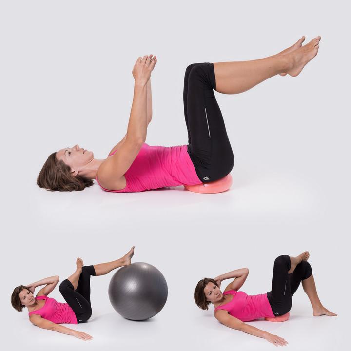 Když umíte pracovat se svým pánevním dnem a transverzálním břišním svalem, můžete začít posilovat šikmé břišní svaly. Nejlepší je začít s overballem, který si dáte tak napůl nafouknutý pod pánev - pánev se vám automaticky naklopí dolů směrem k podložce a lépe se vám budou aktivovat svaly pánevního dna.
