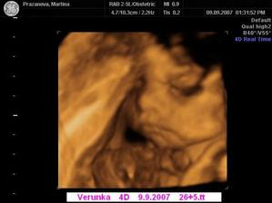 Dne 3.4.2007 to vypadá dle testů, že to vyšlo a my se snad dočkáme našeho vytouženého miminka a já nikdy nezapomenu děkovat a vážit si práce všeho personálu CAR u Apolináře. Dne 19.4.2007 nám bylo v CAR ultrazvukem potvrzeno, že opravdu čekáme naše vytoužené miminko. Dne 4.6.2007 jsme byli na genetickém UTZ ve 12+4.tt a UTZ dopadl na 1*. Dnes 26.7.2007 jsme byli na 3. ultrazvuku, jsme ve 20+2.tt a miminko je v naprostém pořádku. S maminkou už je to horši, ale snad všechno nakonec dobře dopadne. Dne 30.8.2007 jsme byli neplánovaně na 4. ultrazvuku a monitoru, protože maminka upadla na schodech, naštěstí je miminko v pořádku a neutrpělo žádnou újmu. Dnes 9.9.2007 jsme byli s tatínkem na 4D ultrazvuku v Gennetu Praha, máme krásné fotečky a DVD. Dozvěděli jsme se, že miminko v mém bříšku je holčička. Večer 9.9.2007 jsme naší holčičce vybrali jméno, je to Verunka.