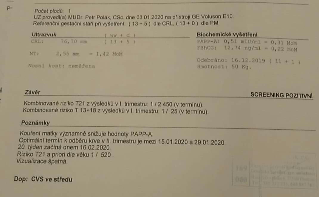 Ahoj holky, dnes sem byla na screeningu v 1 trim. Vysledky krve pozitivni, moc tomu nerozumim t21 1/2450 v 1 trimesstru a T 13+18 1/25 v 1trimestru a v poznamkach T21 a prioru dle veku 1/520,ceka me odber plodove vody. Snad bude vse ok