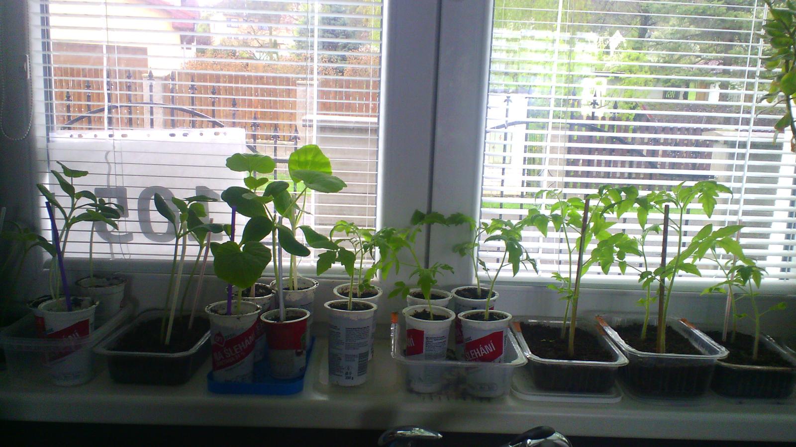 "On žije!!!" :-D 12 rajčat a 11 rostlinek dyni :-) Vážně mám radost - je to poprvé, co mi něco vyrostlo ze semínek a vypadá to nadějně :D