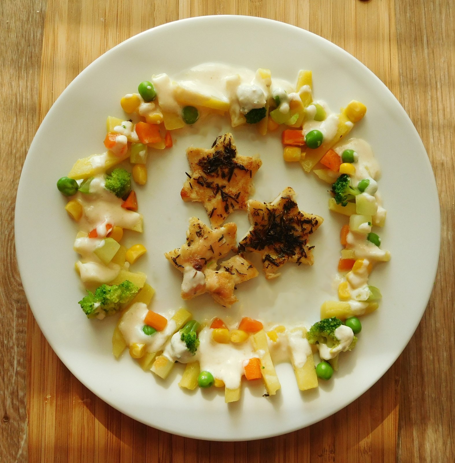 vařené bramboryzelenina vařená na páře: karotka hrášek brokolice kukuřice kedlubendresing: bílý jogurt + šťáva z pečeného masa