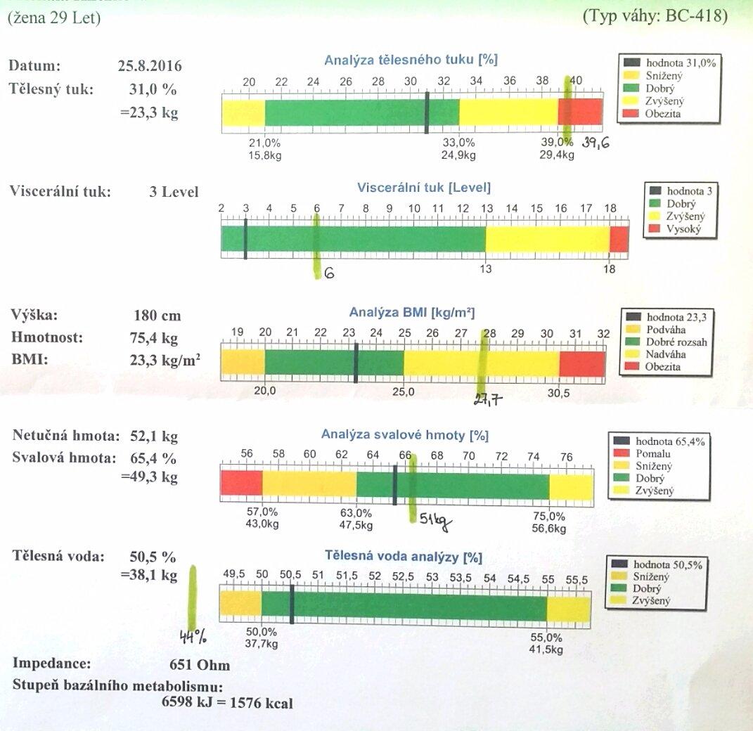 Obrovska oslava. Prvne jsem zacala posledni dva tydny s pohybem - dvakrat tydne rychlochuze 45min a za dva tydny jsou dole 3kg TUKU. Svalu dole jen cca 300g. Zelene jsem nakreslila do papiru stav na zacatku hubnuti - dnes prvně jsem všude v normě