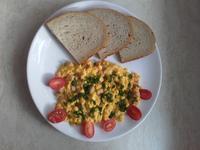 Ja mela dnes michana vajicka ze 3 bilku a 1 zloutku k tomu trosku kvalitni sunky a hromadu ruzne zeleniny 🙂 jo a platek eidamu 🙂