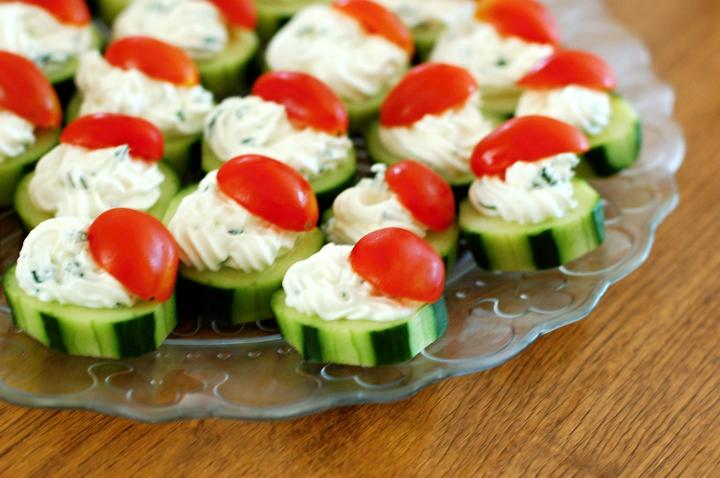 Salátovou okurku omyjeme a nakrájíme na kolečka. V misce smícháme vaničku tvarohu s lučinou, osolíme, opepříme a přidáme najemnou nakrájené čerstvé bylinky - pažitka, petrželka, bazalka, tymián. Na plátky okurek naneseme pomazánku např. zdobícím sáčkem. Ozdobíme půlkou cherry rajčátka.