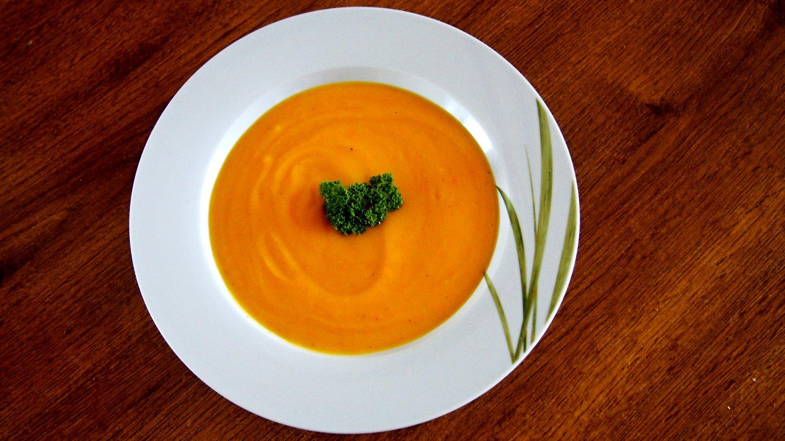 Dýni omyjeme, vydlabeme semínka a nakrájíme na menší kousky. Cibuli také nakrájíme na menší kousky, česnek oloupeme a nasekáme najemno. V hrnci rozpálíme olej, chvíli opékáme cibuli s česnekem a přidáme dýni. Zalejeme vodou jen tak, aby byla dýně ponořená a vaříme dokud není dýně měkká. Rozmixujeme tyčovým mixerem.