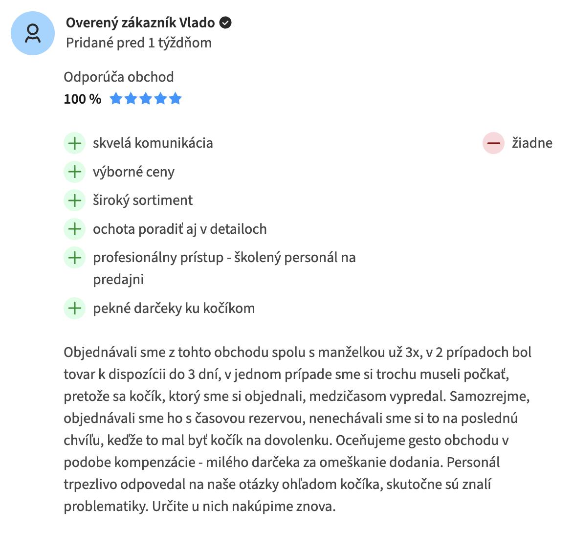 „Z tohoto obchodu jsme s manželkou objednávali už 3× – ve 2 případech bylo zboží k dispozici do 3 dnů, v jednom jsme si museli trochu počkat, protože se kočárek, který jsme si vybrali, mezitím vyprodal. Naštěstí jsme objednávali s předstihem, protože šlo o kočárek na dovolenou. Oceňujeme gesto obchodu v podobě kompenzace – milého dárku za zpoždění. Personál trpělivě odpovídal na naše dotazy ohledně kočárku, opravdu se v tom vyznají. Určitě u nich nakoupíme znovu.“