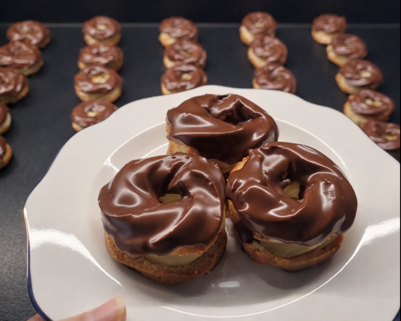 Věnečky s crème pâtissière, tedy žloutkovým krémem, mám moc ráda, vždycky jsem je dělala klasické, s cukrovou polevou nahoře. Té čokoládové jsem nevěřila, protože takový čokoládový větrník je, oproti karamelovému, strašná slabota.