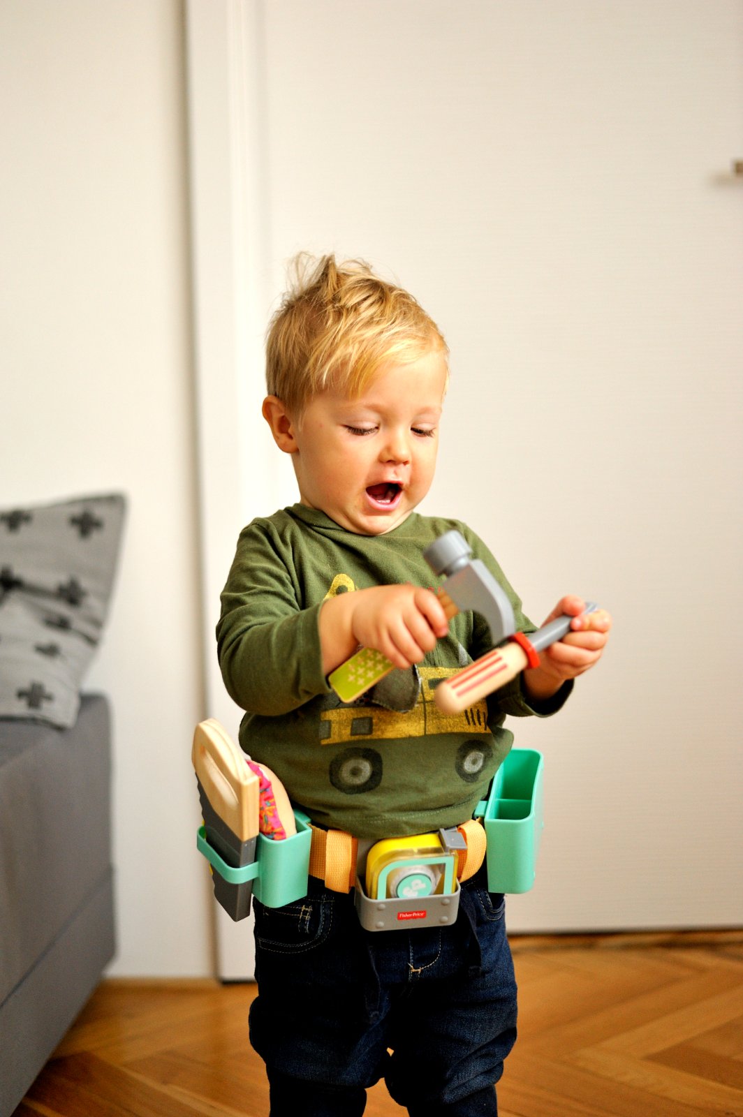 1) Opasek na nářadí - nejen pro malé kutily ale i kutilky super dárek 🔧🔩📏 hlavně když děti rády napodobují manuální práce - budou mít v opasku po ruce kladívko, metr, šroubovák, pilu a kdyby přišel hlad, tak i měkkoučký donut 🍩 Blíže můžete mrknout tady 🙂 Sada je určená pro děti od 3 let, ale jak jste mohly vidět, u ani ne dvouletého Maxima je ve veliké oblibě (a opasek mu i sedí) 😍
