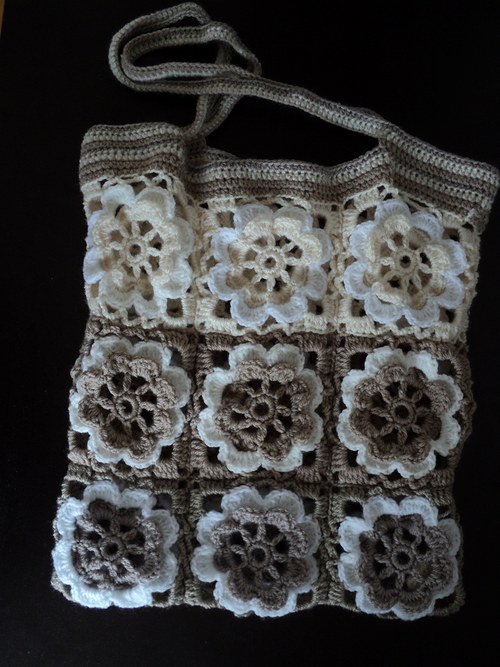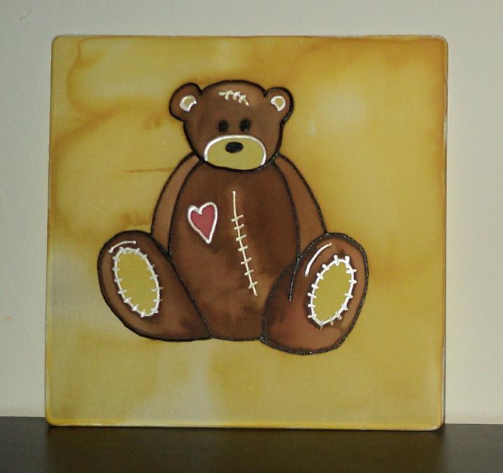Mohu uplést i jiné modely, pro ukázku jsem do fotogalerie zařadila i další kousky, které jsem pletla pro své děti, jsou to růžovo bílé šaty a námořnický komplet. Pro kamarádku a na objednávku jsem háčkovala tašky s velkými květy, pro představu taška má rozměry 38×42cm. Občas taky maluji na hedvábí a jako ukázka – malovaný hedvábný obrázek s medvídkem do dětského pokoje, obrázek je vhodný jen na postavení na poličku, rozměr 20×20cm.