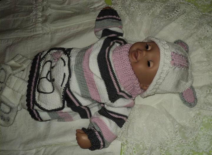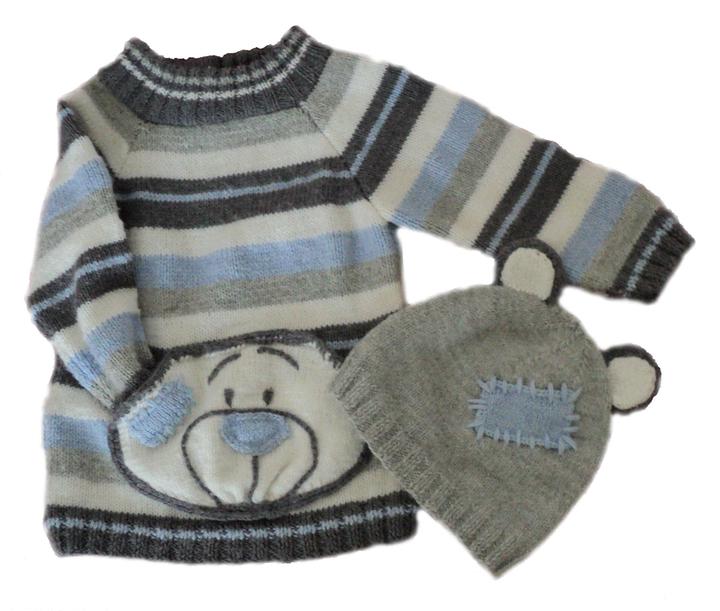 Z mých rukou pocházejí také pletené soupravy pro děti – svetřík s klokaní kapsou se zvířátkem a ušatou čepicí. Tyto svetříky mají prodlouženou délku, aby netáhlo na záda, a velmi pružný roláček u krku (neznám dítě, co by rádo oblékalo roláčky, takže abychom nemuseli spolu zápasit při oblékání🙂. Tyto soupravy jsem začala plést pro své děti jako sourozenecké svetříky, aby jim to pěkně ladilo, ale přesto zůstali svoji. Syn dostal na kapsu oblíbeného medvídka, dcera zase myšku s kytičkou. Další soupravu jsem pletla na objednávku pro miminko. Tyto soupravičky tedy pletu jen na objednávku, abych mohla co nejlépe vyhovět rozměrům i barvám.