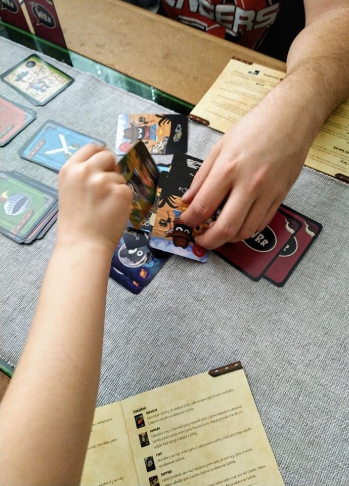 Karty, to byla ovšem jiná písnička. Začátek byl náročnější. První hru dcera vlastně jen přihlížela, jak se mi dospěláci plácáme v pravidlech. Každý jsme měli při ruce příručku s pravidly a postupovali krok za krokem podle instrukcí, četli si jak která postavička může ovlivnit hru a já pak radila dcerce, jakou kartu použít, kterou si nechat a kterou zahodit.