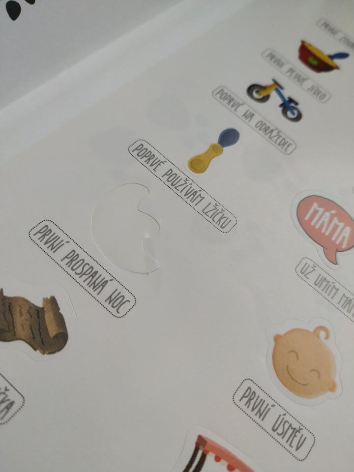 Deníkem nás maminky znovu provázejí krásné obrázky, žádná cizí miminka, žádné dudlíky, lahvičky, chrastítka... Stránky knihy si můžeme dozdobit samolepkami, které se nacházejí na poslední straně. Myšlenka dobrá, ovšem samolepky jdou trošku hůře slupovat a pokud se těšíte, že si ji nalepíte i s popiskem, máte smůlu, ten si buď musíte vystřihnout zvlášť nebo dopsat. Kdyby samolepka zůstala v celku, bylo by to lepší.