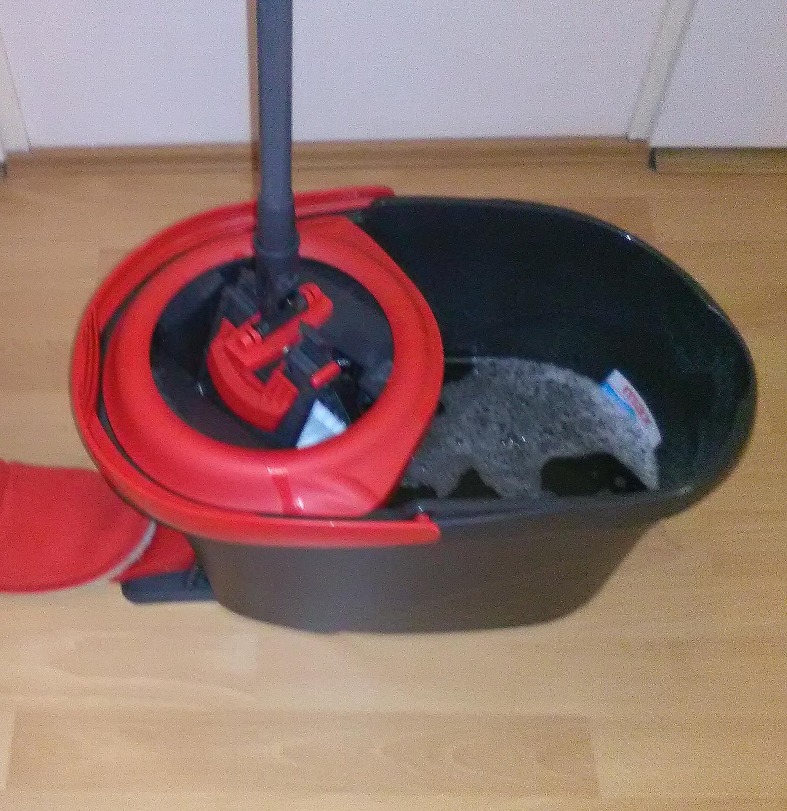 Máchání ve kbelíku bylo v pohodě, nějak se tam hlavice vždycky napasovala a poté nastala mírná alchymie s tím, jak vložit mop do ždímacího mechanismu. Na krabici je znázorněno, že se má vkládat v úhlu 90⁰C. Vodící lišty na mopu pak do ždímacího koše zajedou.