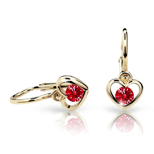 Krásné zlaté náušničky ze 14karátového zlata jsou doplněné červeným zirkonem. Je zde použito bezpečné zapínání (brizura), nemusíte se tedy bát, že vaše holčička náušničky ztratí. Cena - 1 890 Kč.