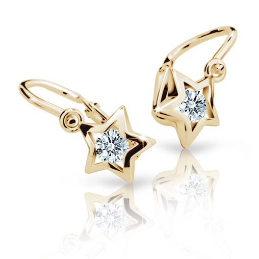 Zlaté náušničky ze 14karátového zlata jsou doplněné bílým zirkonem. Je zde použito bezpečné zapínání (brizura), nemusíte se tedy bát, že vaše holčička náušničky ztratí. Obrovskou výhodou je jejich nízká hmotnost. Cena - 1 970 Kč.