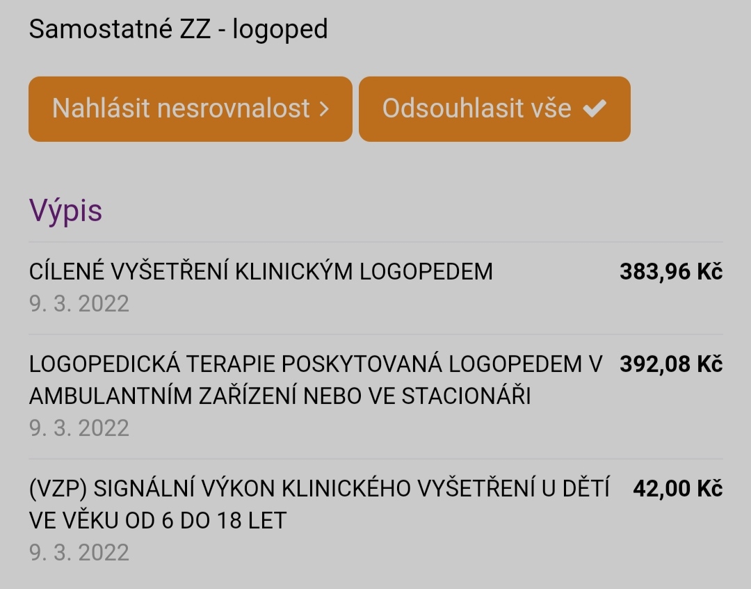 tohle ve výpisu od lékařů neměla a to, když se neobjednáváme přímo v ordinaci, tak volám, na zubni posílám sms. Takže mě to přišlo nestandardní. Ale ke kontrole jsem to pojišťovně neposílala, jen abych předešla otázkám. Byla jsem ráda, že jsme se paní logopedky zbavily a už tam nemusíme.