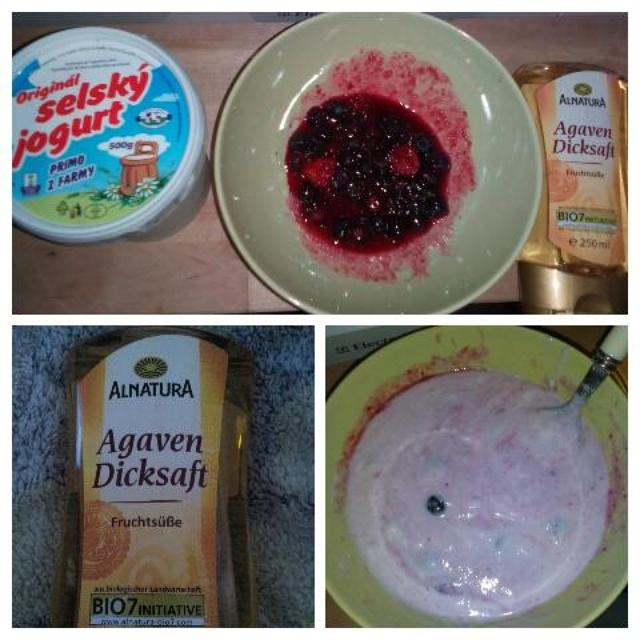 Takto začínám 18TT 🙂 ... Maliny a borůvky jsou původně ze zahrádky (momentálně z mrazáku 🙂), jogurt jsem koupila na farmářských trzích a sirup je z dmka 😉 ... Přeju pěkný den všem.