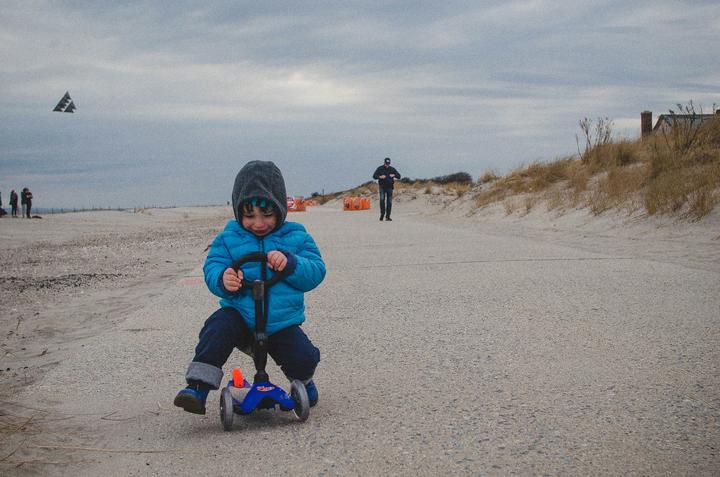 Mini chlapik poprve vetral narozeninovou kolobezku a letos poprve na plazi.