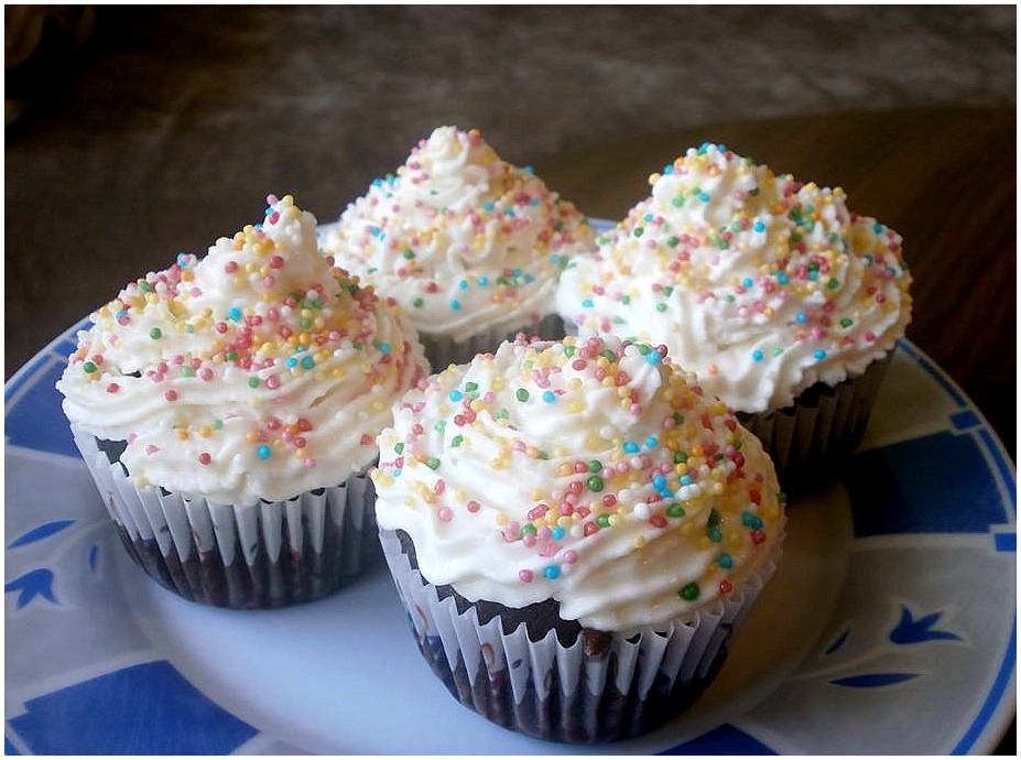 Cupcakes, které jsem dělala pro kamarádku na oslavu narozenin. Spodek čokoládovo-banánový, vršek z mascarpone, tvarohu a moučkového cukru.