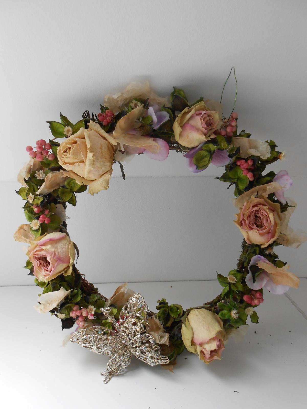 Věnec s růžemi a motýlkem