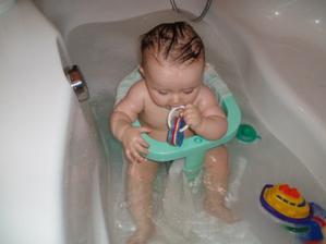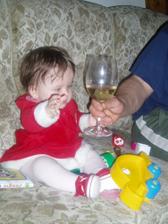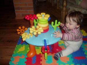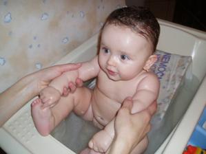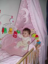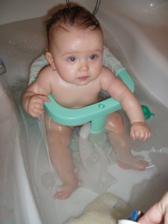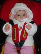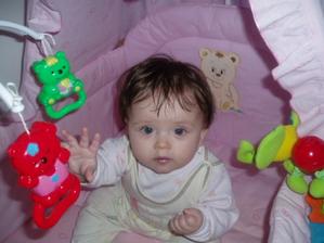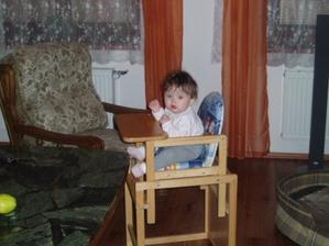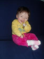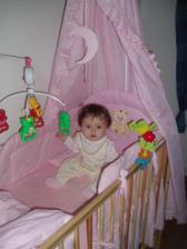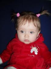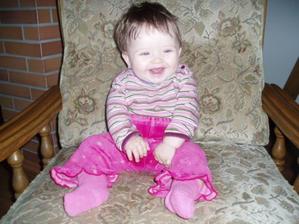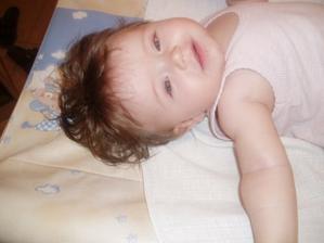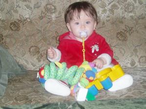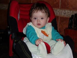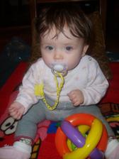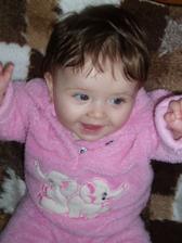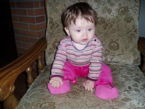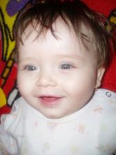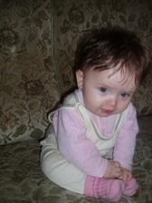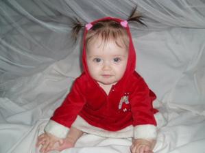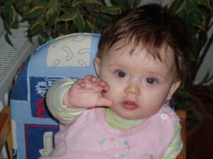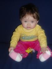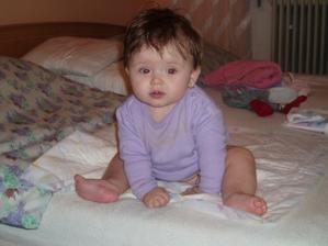 V půl roce vážíme 8.20 kg a měříme 68 cm.Sami sedíme i když ještě někdy trochu nejistě. Papáme jídlo dospělích v kašičkách. Umíme a to moc dobrě slovo "am". Pusu máme od ucha k uchu a spinkáme v noci celých 12 hodin. Pořád kojíme, ale už bue brzy konec. Mlíčka pomalu ubývá. A rosteme dál......V osmi měsících vážíme 8.38 kg a měříme 69 cm.