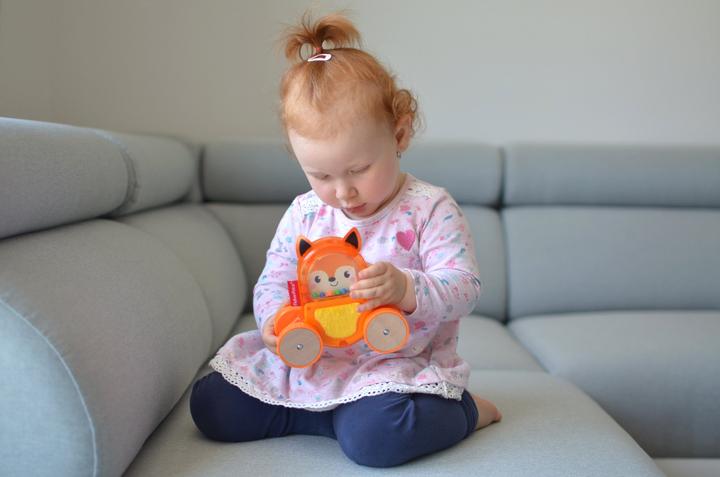 Připravila jsem si pro vás malou recenzi na zvířátko na kolečkách - máme doma lištičku. Je určena pro děti od 9 měsíců, ale myslím si, že by udělala radost i půlročnímu miminku, které už na bříšku zkoumá vše kolem. V nabídce je lištička, kuřátko a myška a každé z těchto zvířátek skrývá jiné zábavné aktivity. Lištička má v tělíčku kuličky, takže když jede po zemi poskakují v průhledné hlavičce. Z druhé strany děti zaujme mechanismus ozubených koleček, který by děti jistě rádi prozkoumaly ještě blíž 😅 Každé zvířátko je na kolečkách, takže může podněcovat děti k lezení či chození. Jsou to roztomilá zvířátka, která mají heboučkou srst, zajímavá ouška a svými aktivitami i vzhledem zaujmou chlapečka i holčičku.