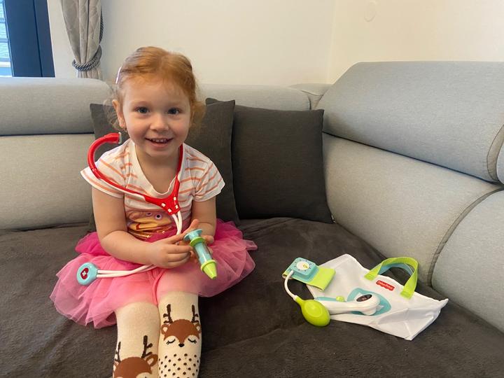 Hra na doktorku je teď jedna z nejoblíbenějších. Doma Nelča ošetřuje miminka, ale nevyhneme se kontrole ani my - já s tatínkem a Kubíkem 😃 A po vzoru doktorů - za statečnost dostáváme obrázky 😁