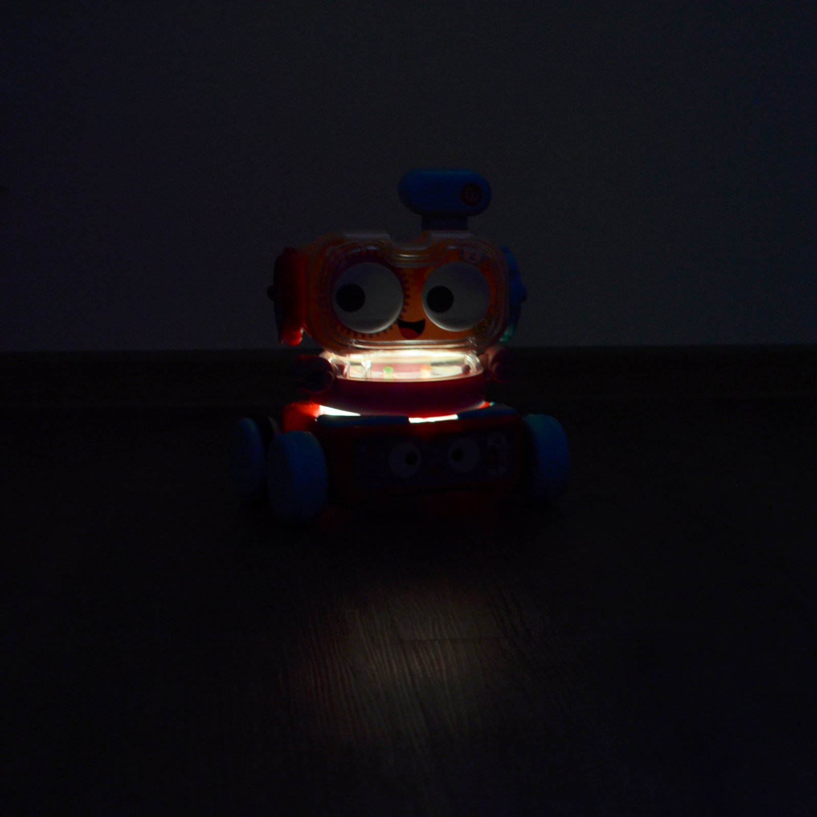 Na horní straně základny se nacházejí dvě velká modrá tlačítka, která budou děti zajímat nejvíce. Stisknutím aktivují robota, který se jim zvesela bude věnovat (dle nastavené úrovně). S tlačítkem not poznáte mnoho nových, krásných a rytmických písniček a s vedlejším (pravým) tlačítkem se naučíte barvy, tvary, počty a abecedu. Aktivita robota je doprovázena barevnými efekty vycházejícími z jeho středové části. Ta je rozdělena na čtvrtiny (trojúhelník, kolečko, čtverec a srdíčko) přičemž každá jeho část děti rozvíjí jak po stránce rozpoznání barev, tak i tvarů.