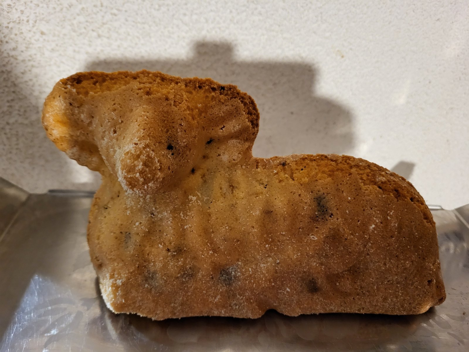 Upečeného beránka vyndáme z trouby a necháme formu vychladnout. Teprve potom ho vyklopíme a ozdobíme mašlí 😉