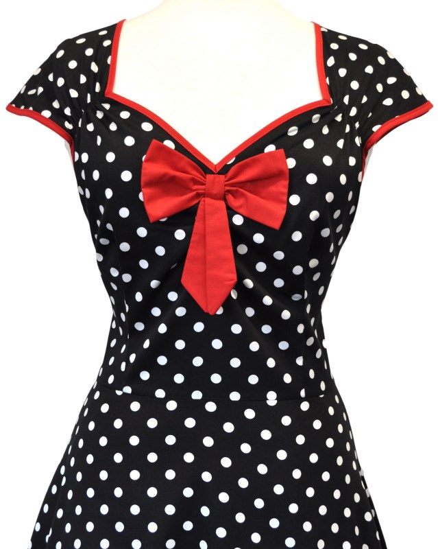 Jen se na ně podívejte! Není to dokonalost? Černé šaty s bílými puntíky, romantickými rukávky a červenou mašličkou (mašlička je odnímatelná) … jedno „ach“ nestačí! :-)