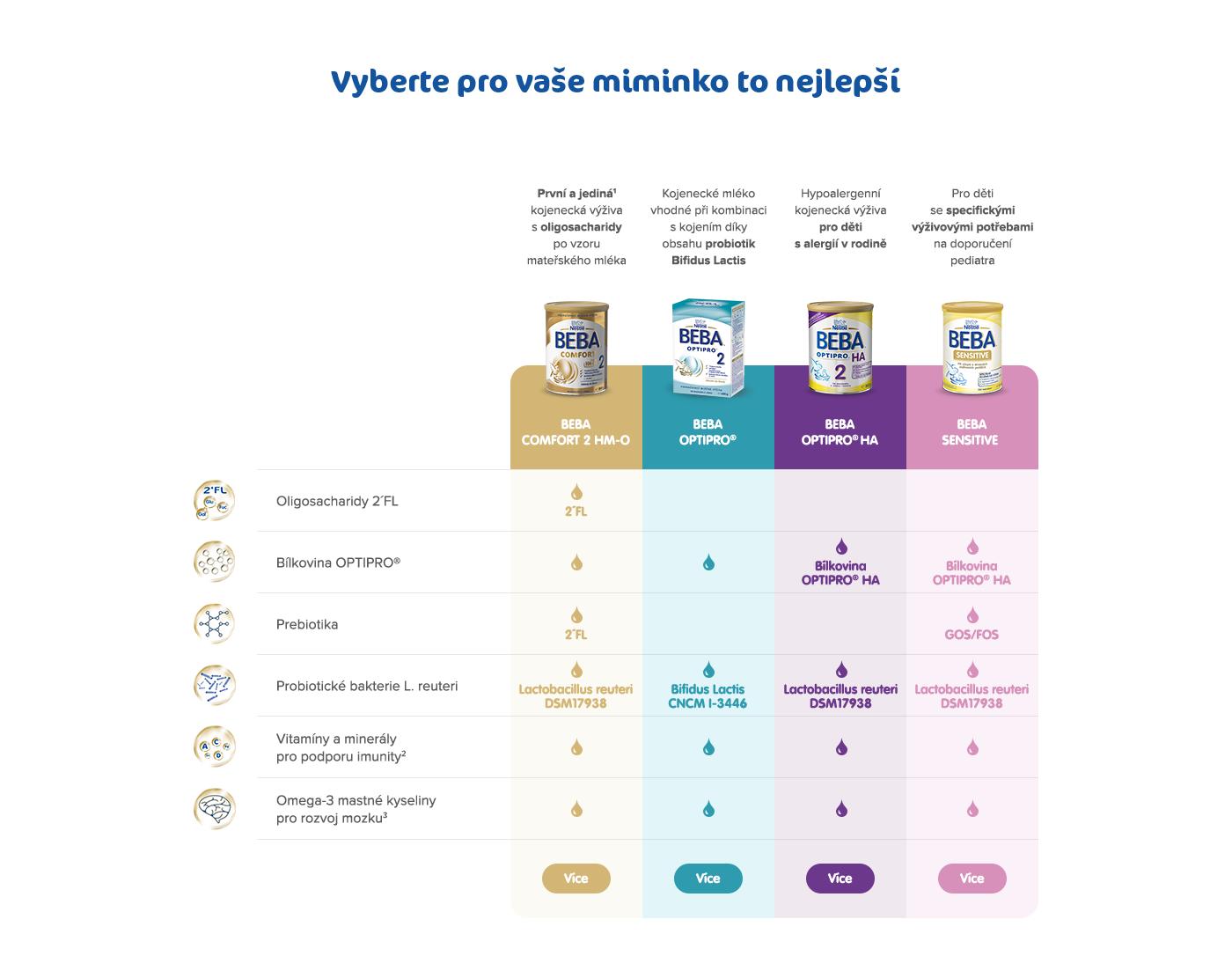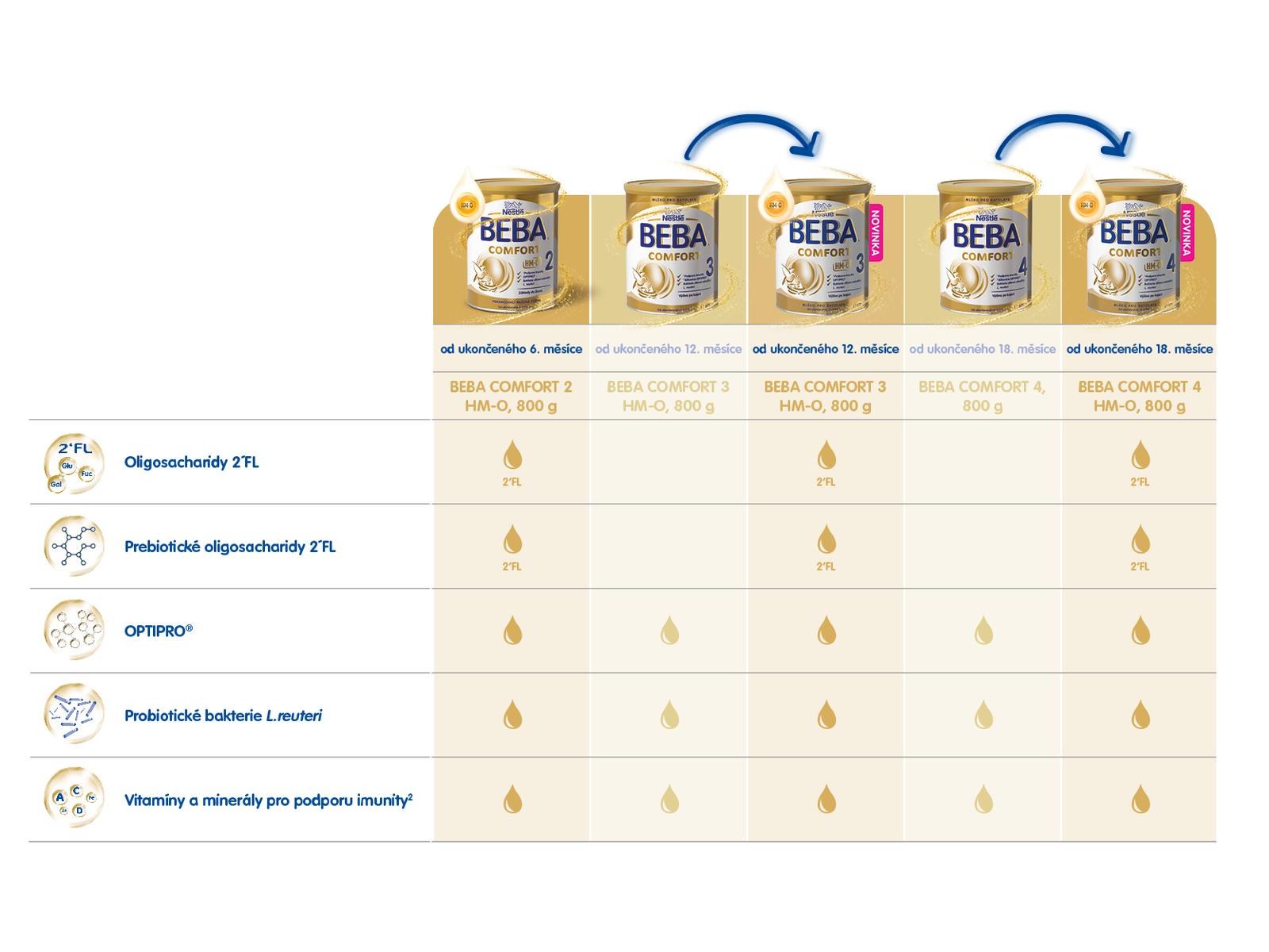 Kojení je pro Vaše děťátko to nejlepší. Pokud již nemůžete kojit, vybírejte náhradní kojeneckou výživu po poradě se svým pediatrem. ¹BEBA COMFORT 2,3,4 HM-O první a jediná v České a Slovenské republice s oligosacharidy 2'FL a probiotiky L. reuteri, která se přirozeně nacházejí ve střevní mikroflóře kojených dětí. ²Minerální látky, železo, zinek a vitamíny A, C, D se podílejí na normálním fungování imunitního systému. ⁴ ³Vápník je potřebný pro normální vývoj a růst kostí u dětí. ⁴ ⁴Obsah ve shodě s požadavky legislativy.