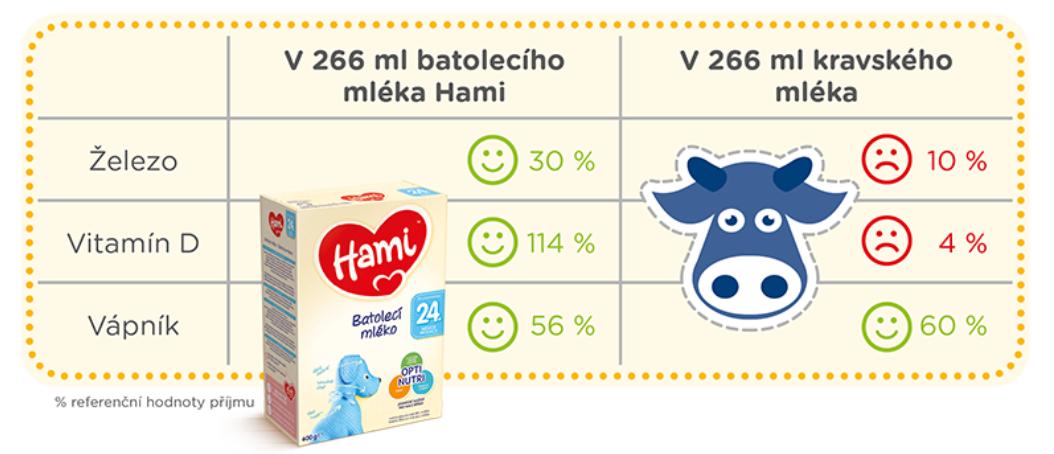 Batolecí mléka Hami se vyrábí na základě vysoce kvalitního kravského mléka. Složením i obsahem vitamínů a minerálních látek jsou přizpůsobena potřebám malých jedlíků. Jsou zdrojem vápníku, mají také více vitamínu D a železa (proti kravskému mléku). Obsahují i celou řadu dalších vitamínů a minerálních látek, jako například vitamin C, E, jód, zinek a další. Kromě toho v nich najdeme také prebiotickou vlákninu GOS/FOS.