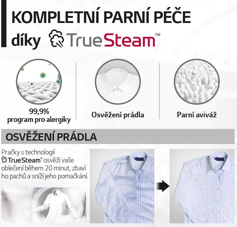 Společnost LG a využívá páru i k dokonalejšímu praní obecně. Už po 20 minutách redukuje pára zápach a pomačkání prádla. Společně s rovnoměrně rozloženou teplotou v pračce a správným navlhčením látek zajistí funkce TrueSteam i snadnější žehlení.