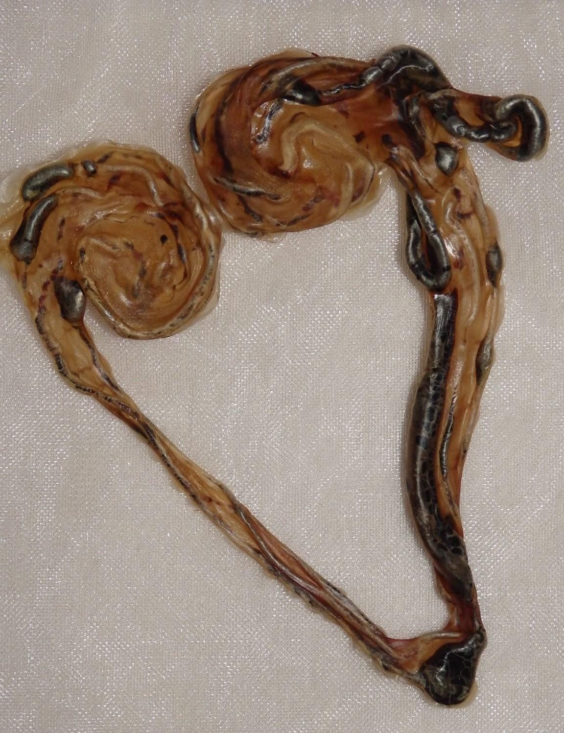 Pár dní po porodu přijela porodní asistentka na kontrolu a přivezla nám zpracovanou placentu do kapsliček, placentovou tinkturu a usušený pupečník ve tvaru srdíčka, na kterém jde krásně vidět uzlík, který tam Alička měla. Je to krásná památka.