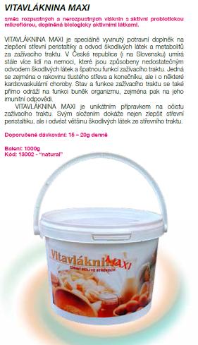 Vitavláknina MAXI je speciálně vyvinutý doplněk stravy na zlepšení střevní peristaltiky a odvod škodlivých látek a metabolitů ze zažívacího traktu. V naší republice umírá stále více lidí na nemoci, které jsou způsobeny nedostatečným odvodem škodlivých látek a špatnou funkcí zažívacího traktu. Jedná se zejména o rakovinu tlustého střeva a konečníku, ale i o některé kardiovaskulární choroby.