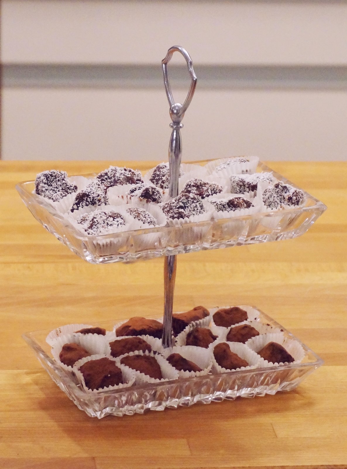 Na jednom ubrousku je kakao, na druhém strouhaný kokos, s úspěchem se ale dají použít i mleté mandle, oříšky nebo cokoli jemně namletého. Povalováním ze strany na stranu se lanýže obalí. Díky tomu potom nebudou tak citlivé na teplo a půjde je i uchopit do prstů bez rizika ušpinění.