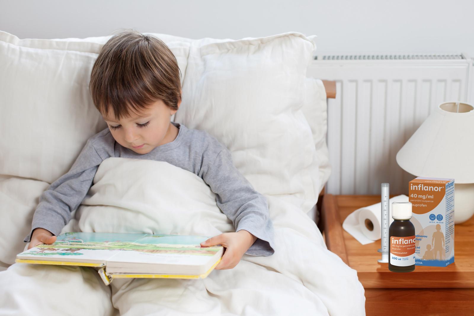 „Maminko, mně je zima,“ posteskl si Vašík a svoje ruce natahoval po objetí. To při nemoci dělá pokaždé. Potřebuje cítit, že tu pro něj jsem. Obejmu ho. Tělíčko mu hoří. Navzdory tomu, že on se cítí, jako by ho ponořili do kádě s ledem. Učebnicová zimnice. Pak si také stěžuje na bolest v krku. Po pohledu do ústní dutiny pochopím. Mandle má nateklé a osázené hnisavými hrudkami. Chudáček malej. Ráno s ním musím k doktorce. Tohle bude nejspíš na antibiotika. Do té doby mu chci alespoň ulevit od bolestí a horečky. Otevírám proto domácí lékárničku, kde na mne vykoukne oranžovo-modro-bílá krabička s nápisem Inflanor. Málem bych zapomněla! Před pár týdny, když jsem dokupovala zásoby v lékárně – vždy totiž musím být vybavena pro případ nouze – jsem si všimla tohoto sirupu. Ono se mu tedy odborně říká suspenze a podle všeho je to novinka na léčbu horečky a bolesti u dětí. Se sirupy máme dlouhodobě dobré zkušenosti, a tak jsem rozhodla Inflanor koupit. A teď se hodí.
