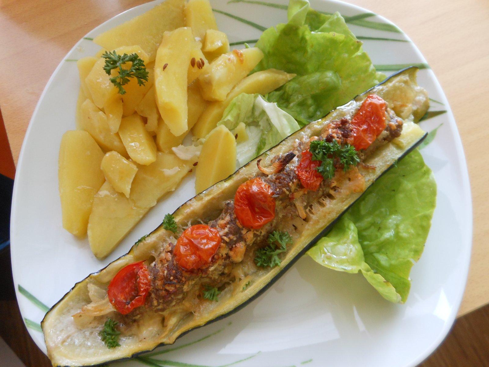 cukety-středně velké 500g mletého krůtího masa 2stroužky česneku 1cibule trocha soli, pepře 100g strouhaného sýru 1/2lžičky sušeného česneku 1/2lžičky koření na mletá masa 6malých cherry rajčátek 2lžíce oleje petrželka na posyp-po upečení cukety rozkrojíme podélně, vydlabeme vnitřky mleté maso smícháme se všemi ingrediencemi a naplníme cukety, dáme cherry-na plátky a dáme pcét na 180 cca 30-35minut