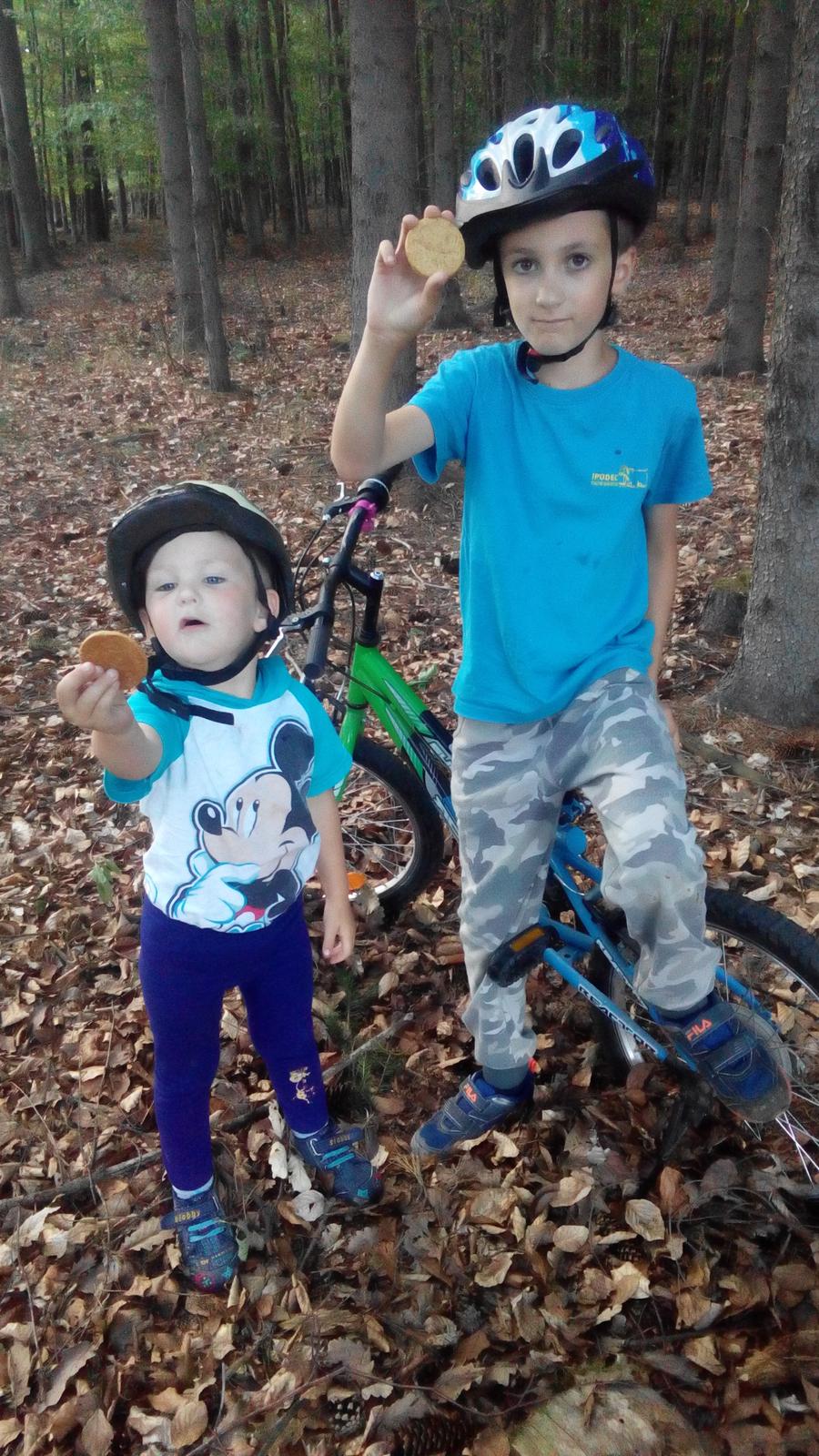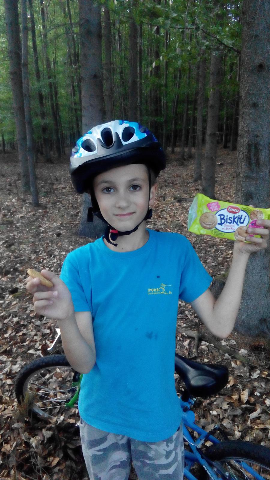 Další den jsme se vydali na kolo, byla to Vojtíkova první vyjížďka a motivací byly právě sušenky, když kousek ujedeme. Tentokrát jsem vzala oříškovo-medové. Na první ochutnání Vojta řekl, že mu nechutnají, asi mu přišly málo sladké. Ale měl na něco chuť a tak si dal další a pak už si je pochvaloval, že jsou vlastně taky moc dobré.