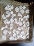 Pak mě napadlo, že by ji mohlo třeba zaujmout na pár sekund něco v televizi. Přesunula jsem všechno do obýváku. TV ji nezajímala vůbec a já zkusila nabídnout cca milion jinách alternativ. Ne! Chtěla to ničit, chtěla mě zničit, chtěla zničit obývák a panence těsto narvat do krku. Uválela jsem z těsta vždy cca 10x10 cm a honem vykrajovala. Ty tvary tomu odpovídají. Když jsem viděla, jak "rychle" mi to jde, z původního slaboučkého těsta, jsem pak už dělala solidní špalky 😀. I to se pak projevilo ve finále. Dobrá třetina těsta šla do koše, na druhý plech nejsem psychicky dostatečně zralá.