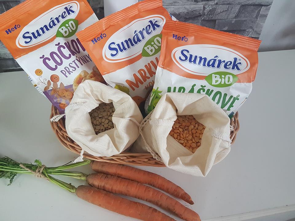 Balíček od Sunárku kurýr dovezl dopoledne, kdy 2 nejstarší byli ve škole. Nejmladšímu to bylo ještě jedno, ale Anetka trvala na tom, že balík rozbalíme. Po otevření na nás koukaly 3 balíčky bio křupek, svazek mrkve a 2 naplněné látkové pytlíčky naaranžované v proutěném košíčku. Upřímně jsem se dost divila, že to takhle přežilo cestu. Tedy až na tu mrkev 😃