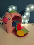 Na internetu jsem ale objevila i trochu jinou verzi prasátka, které má dvě úrovně obtížnosti a i menší bříško, tak už to možná vychytali, nevím, která z nich je novější… 🙂 Prasátku se dále dá zmáčknout čumáček a ono např. zachrochtá a otřepe se, u čehož se Vojtík pořád chechtá. Ani u prasátka nejsou zvuky nijak otravné.