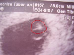 • 16.5.2008 - ráno se mi v práci udělalo zle, bušení srdce jsem cítila až v krku, takže honem k obvoďákovi, natočil EKG, tlak a tep. Hodnoty byly dost vysoké, takže jsme s MM strávili zbytek dopoledne v nemocnici po vyšetřeních. Závěr - nutno snížit pracovní tempo, sinusová tachykardie v těhotenství. Protože jsme měli strach o miminko, v nemocnici jsem i absolvovala utrazvuk. Tam paní doktorka říkala, že asi nebude nic vidět, ale miminko je silák, vidět bylo krásně a tlouklo mu srdíčko 🙂. Velikostně je o 1-2 dny starší než podle data poslední menstruace. Na obrázku je vidět maličká ručička 🙂