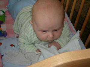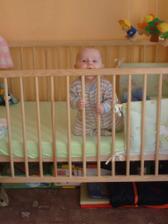 8.6. - nejprve zkoušel, jestli to půjde se postavit, a nakonec se to opravdu povedlo, sám se přitáhl a postavil v postýlce.