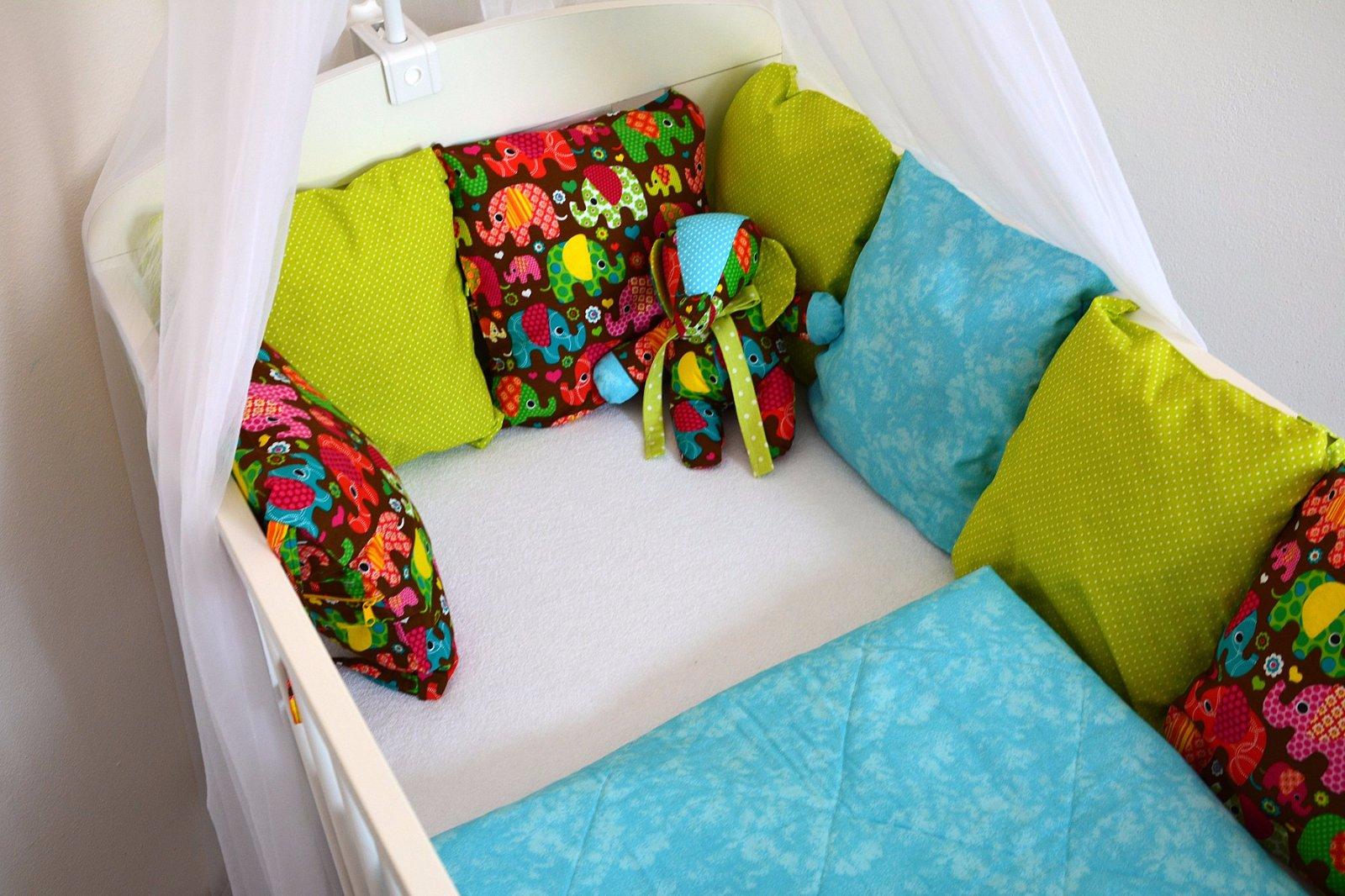 Tady je polštářková kombinace do obývacího pokoje do hrací postýlky. Největší práci mi dal ten sloneček. Nikdy více :)