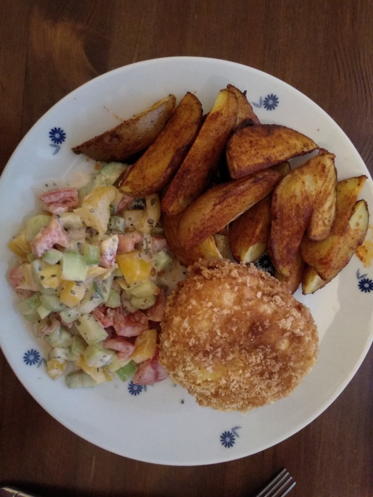 Bezlepkový smažený hermelin-pecene brambory a zelenina smíchana s bílým jogurtem a bylinkami