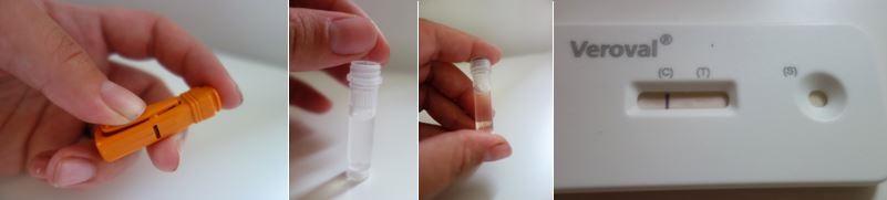 Provedení testu nebylo náročné a postup mi vyhovoval. Připravíte si nádobku s roztokem, otevřete ji. Kapku krve naberete do skleněné kapiláry (malá trubička), kterou pak jen vložíte do nádobky s roztokem, zavřete, protřepete – krev s roztokem se smíchá, naberete pipetou a kápnete do políčka testovací kazety. Za 10 minut máte výsledek.