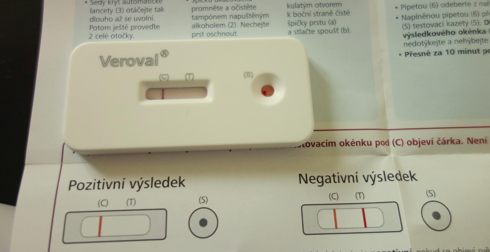 Provedení tohoto testu bylo nejnáročnější. Lancetou se píchnete do prstu, do pipety naberete krev, kterou pak vytlačíte do určeného políčka. Následně do tohoto políčka vylijete roztok z nádobky, kterou musíte odšroubovat, takže je dobré mít zalepený ten ukazováček, ať není všechno od krve, protože potřebujete obě ruce. Čekáte 15 minut, pak zvednete testovací kazetu, zaklapnete modré šoupátko, test položíte a zase 15 minut čekáte. Pak konečně se dozvíte výsledek.